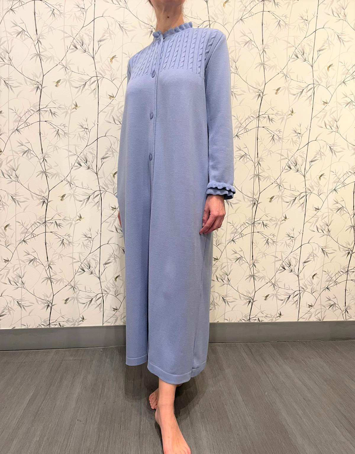 • Bata de punto con canesú de ochos y pequeño volante en cuello y puños. Cierre con botones. 1 bolsillo lateral. También con cuello de punto (especificar).