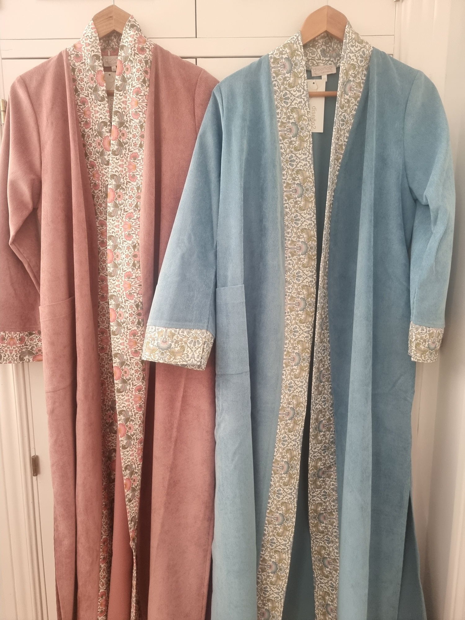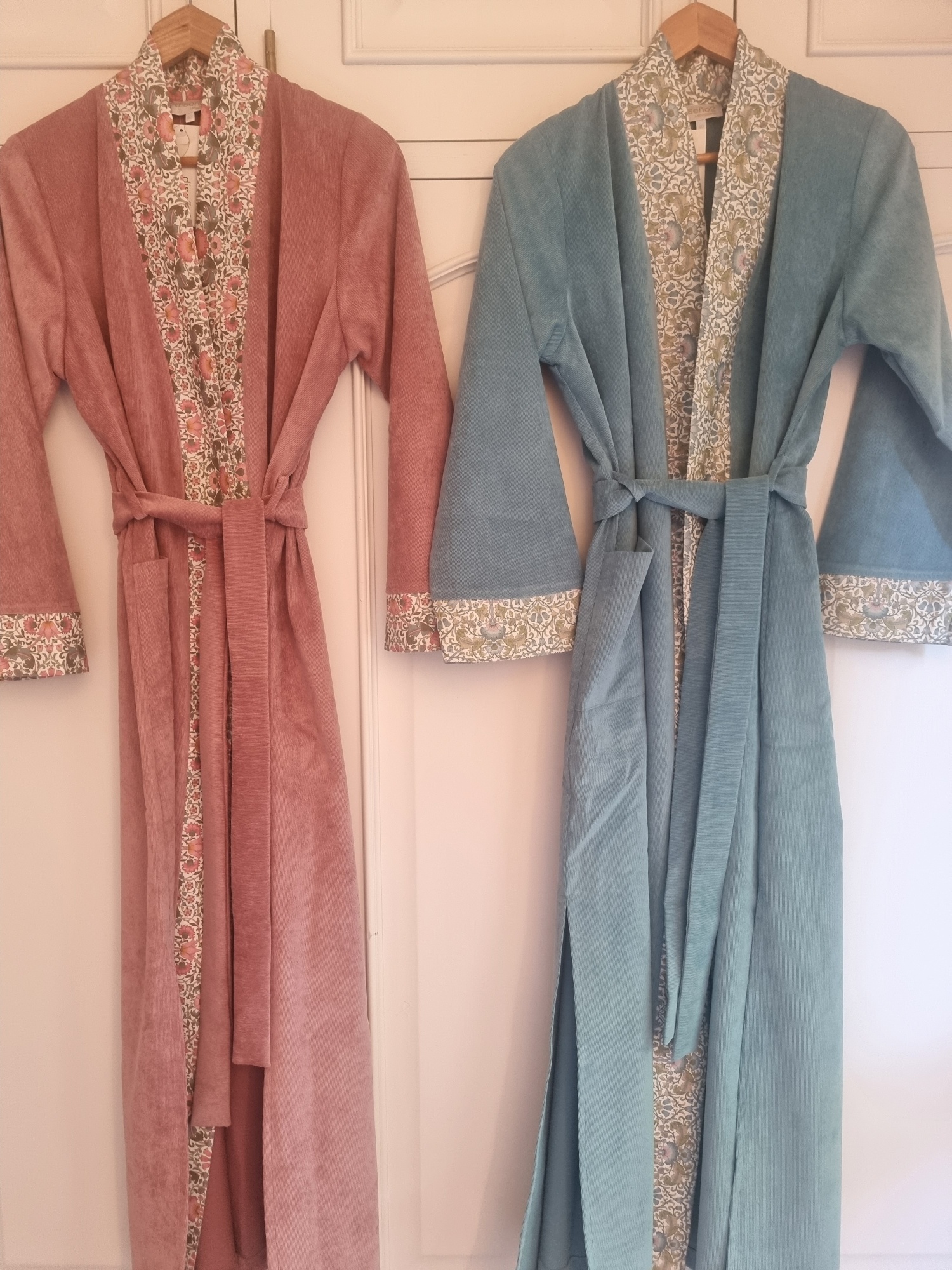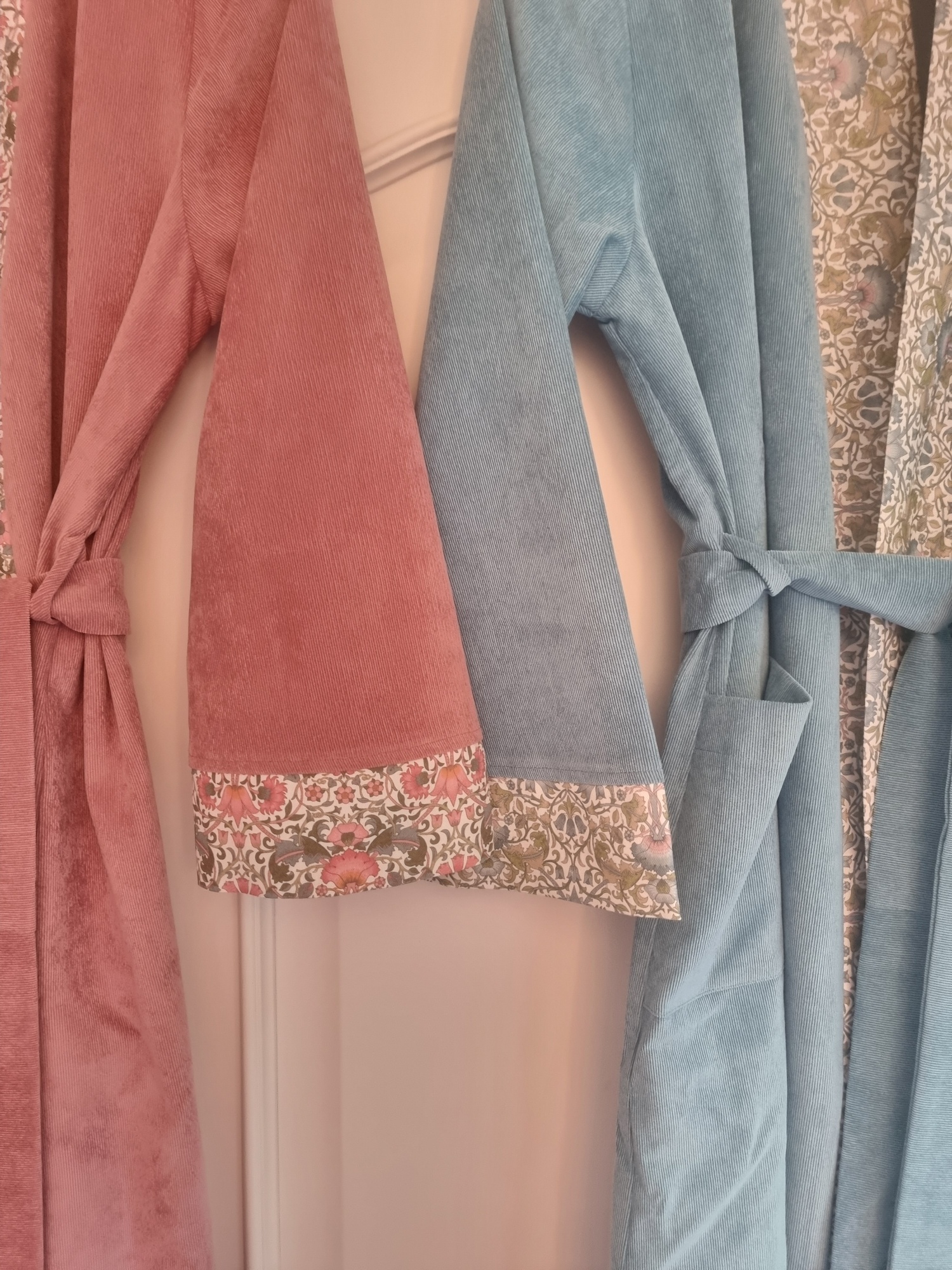 - Bata de corte clásico confeccionada en micropana suave con tiras de algodón estampado en el delantero y puños. Cinturón. 1 bolsillo exterior.