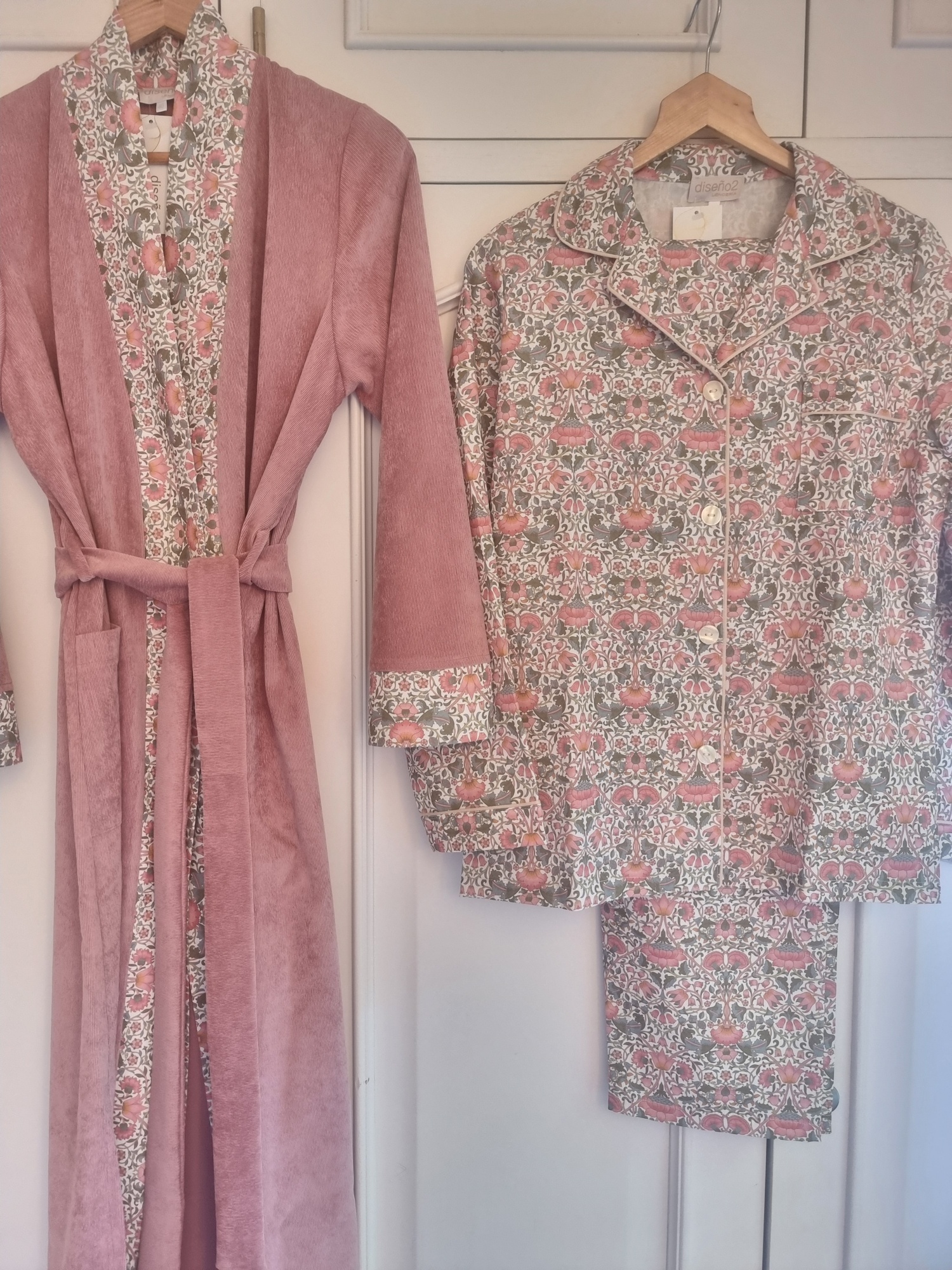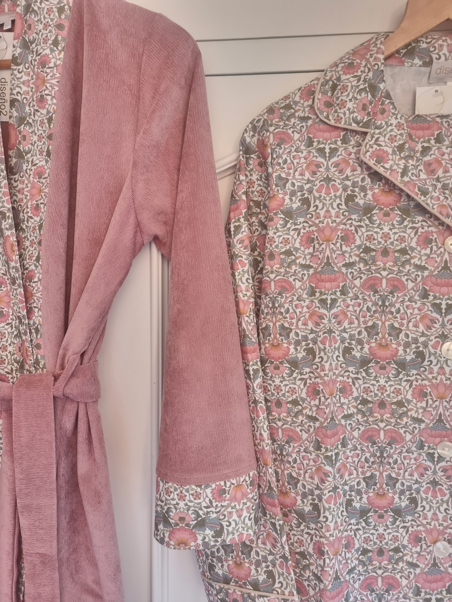 - La bata rosa empolvado tiene pijama a juego de viyela.