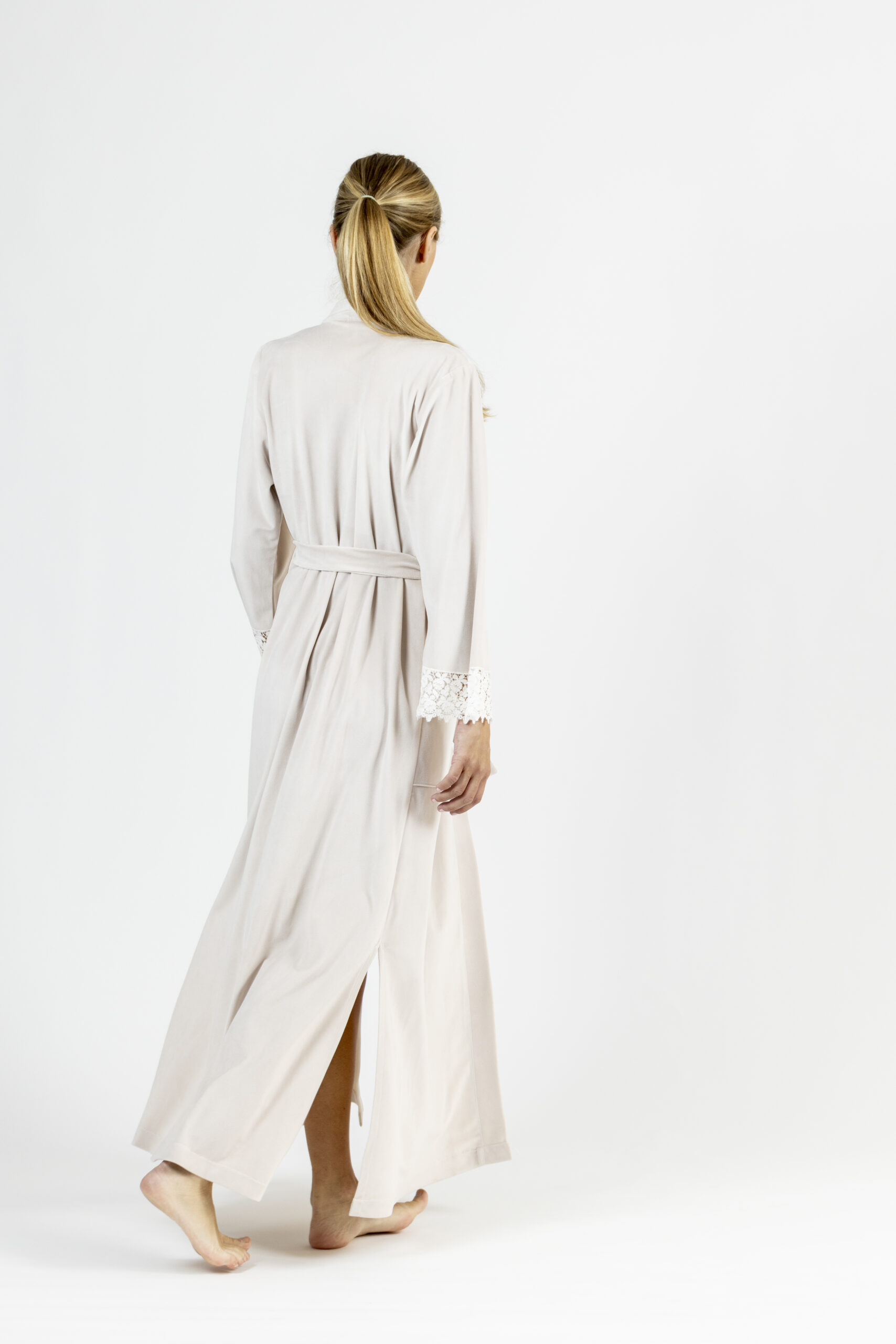 • Bata de terciopelo con encaje con dibujo de hojas en los puños. Manga 3/4.  Cinturón.  1 bolsillo exterior.