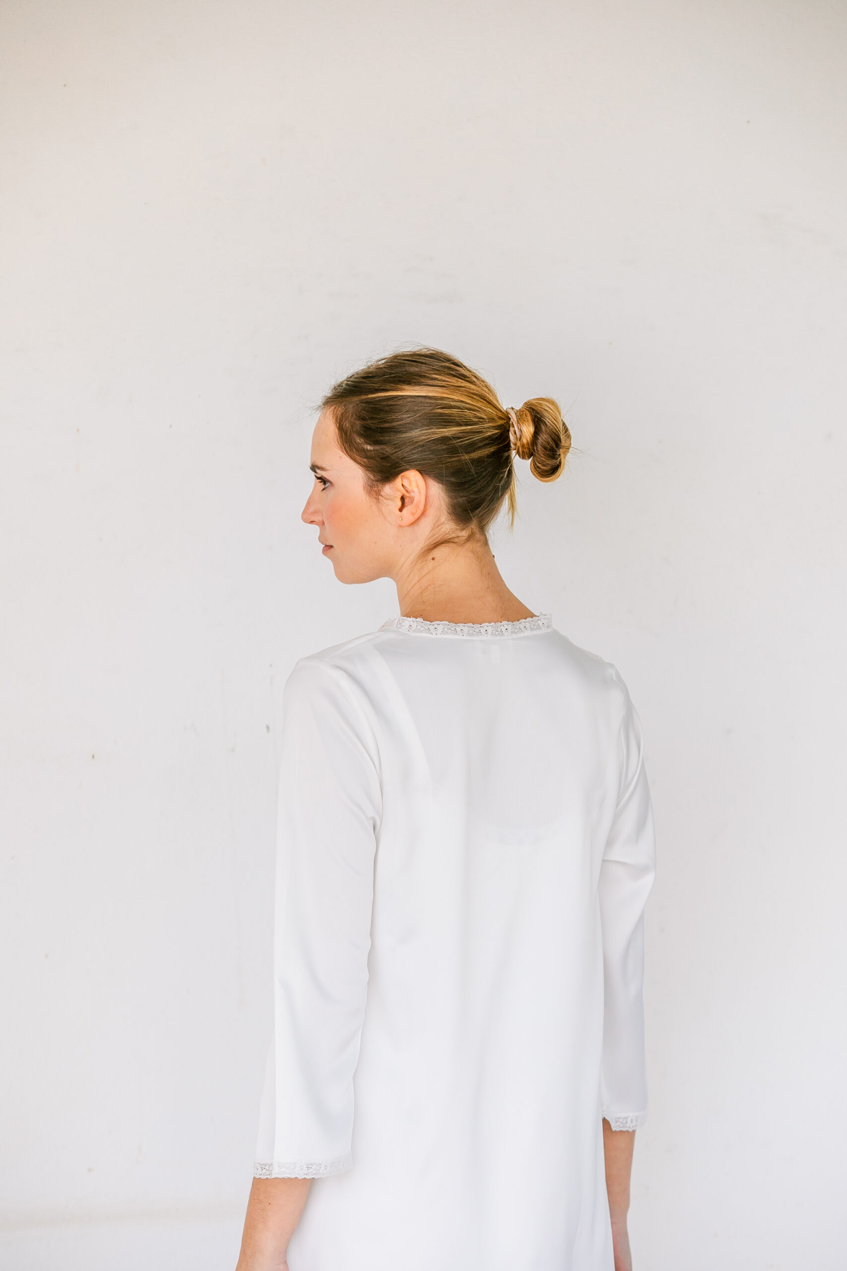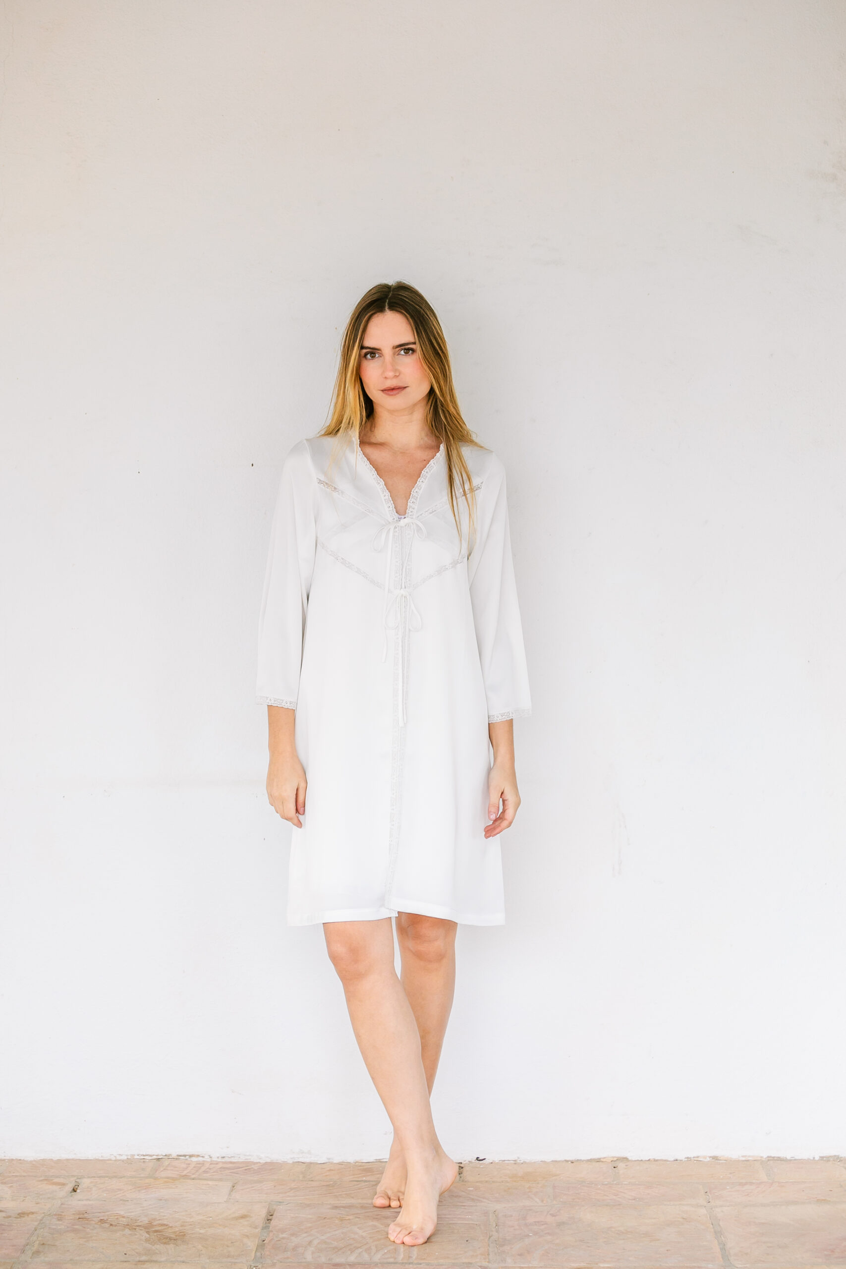 • Bata de raso blanco con varios encajes en el delantero. Cierre con dos lazos.
