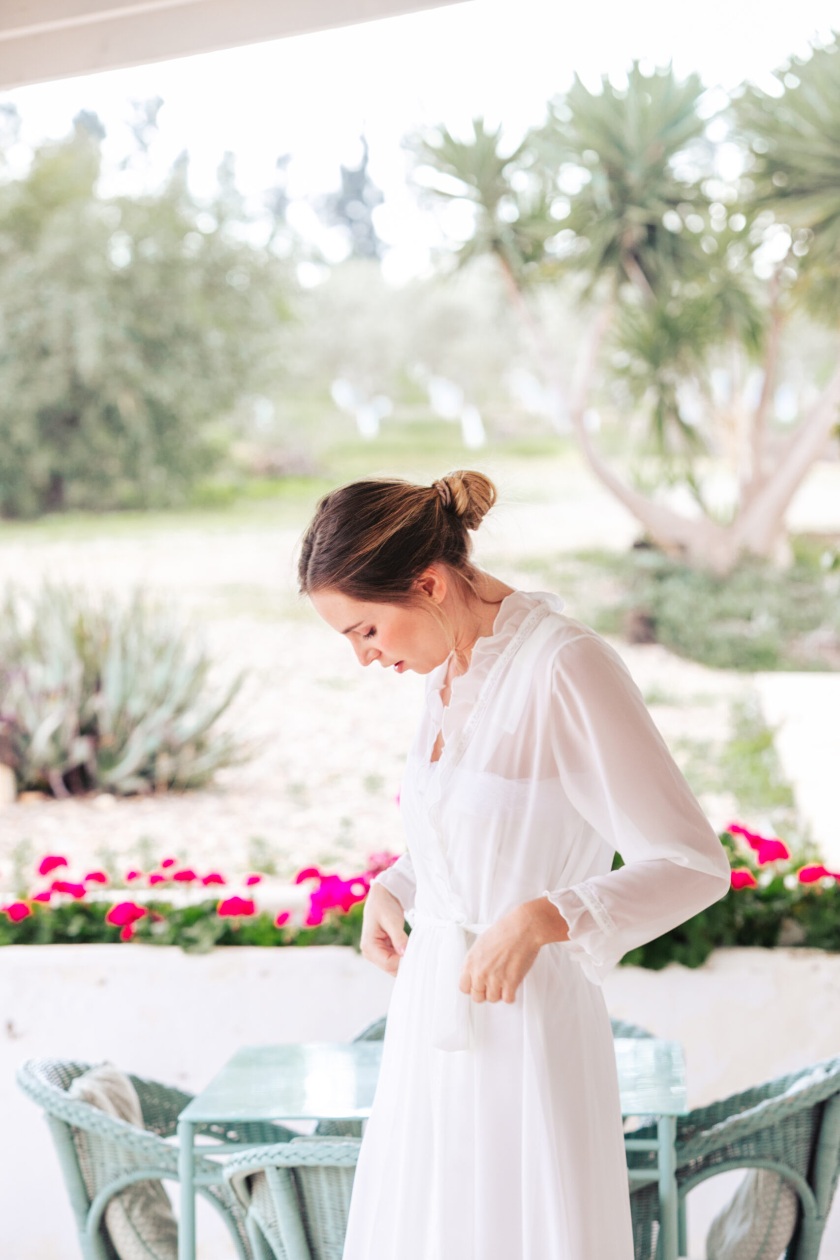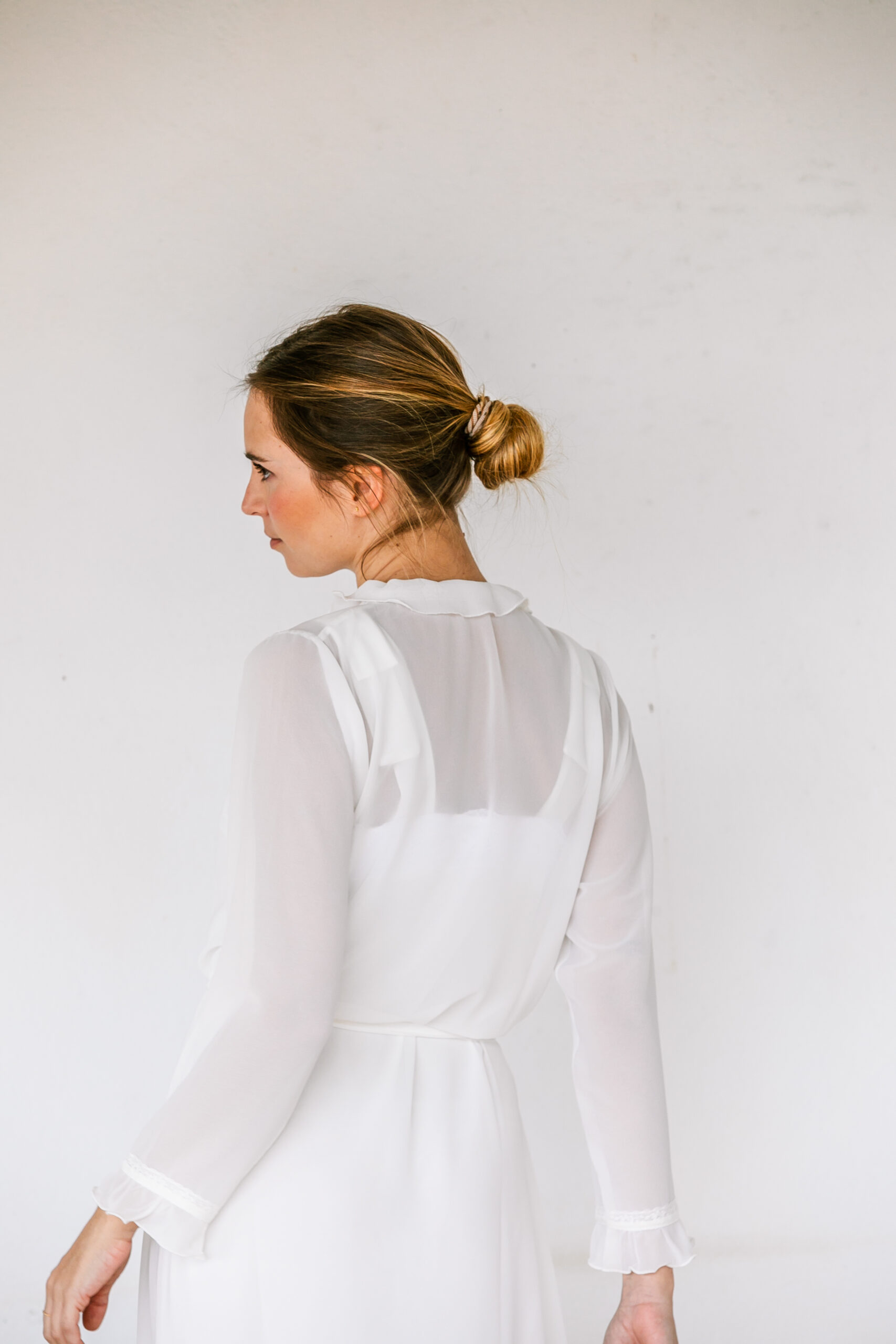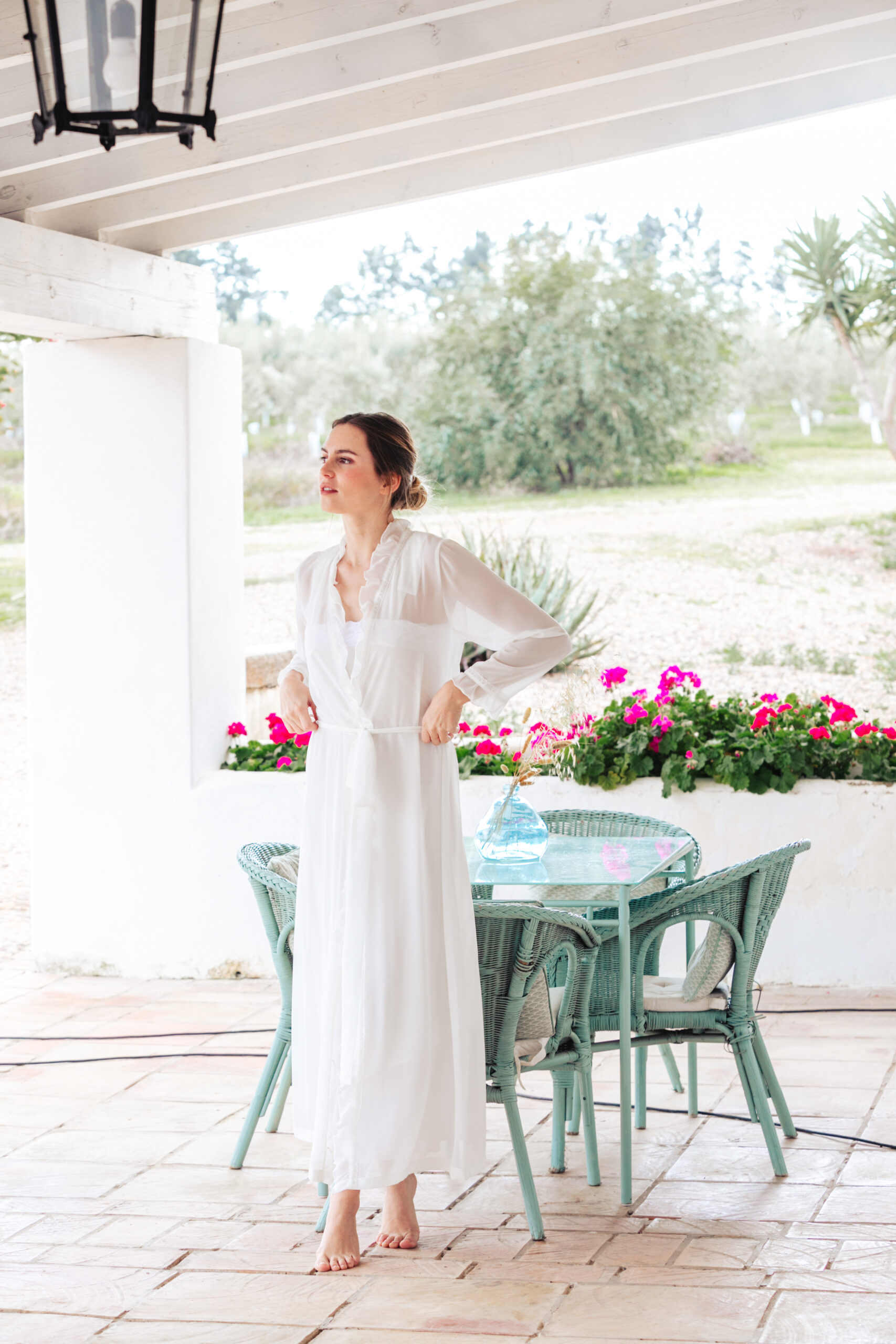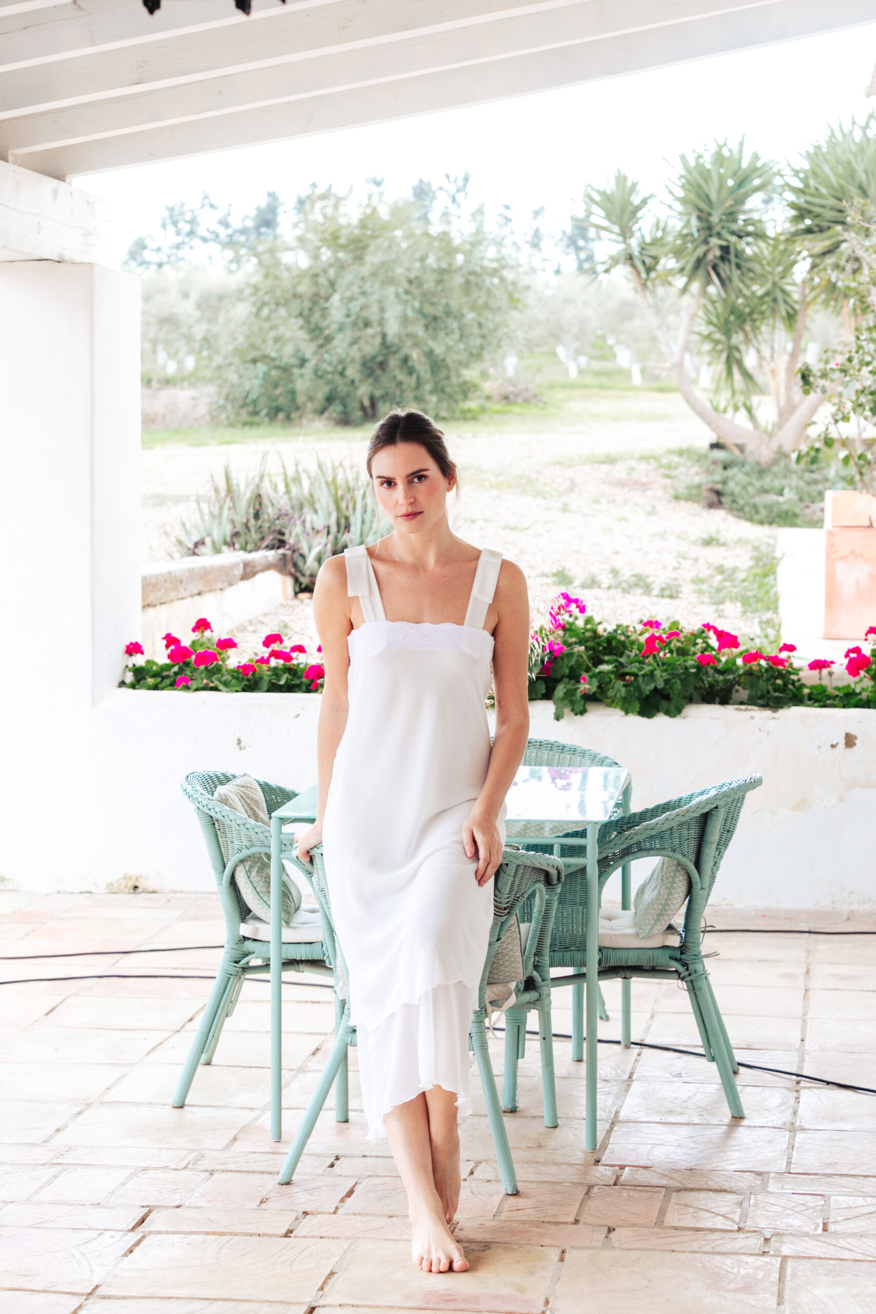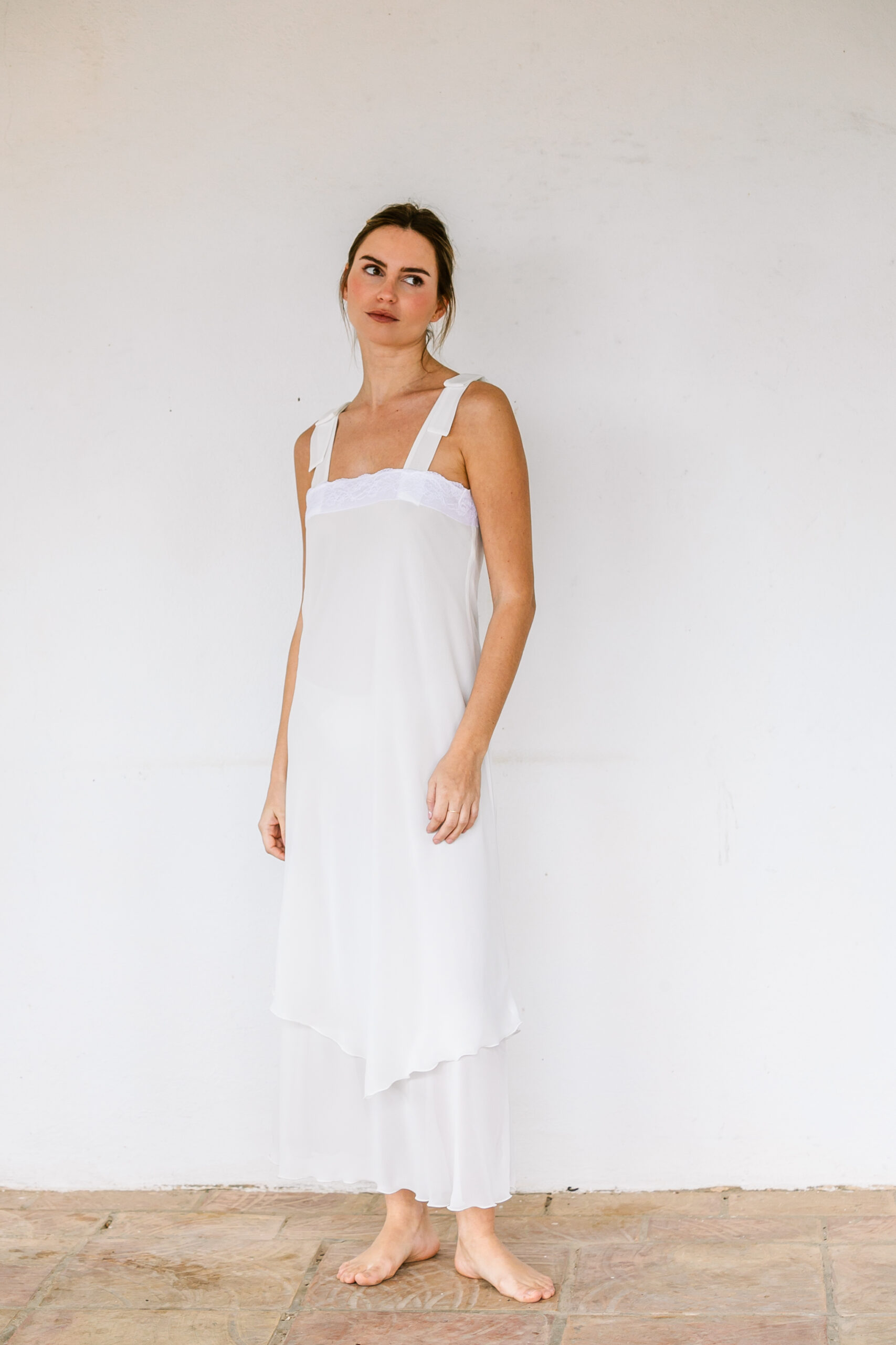 • Camisón largo de dos capas de gasa, una más larga que la otra.  Escote recto con encaje al tono y tirantes anchos con adorno de lazo.