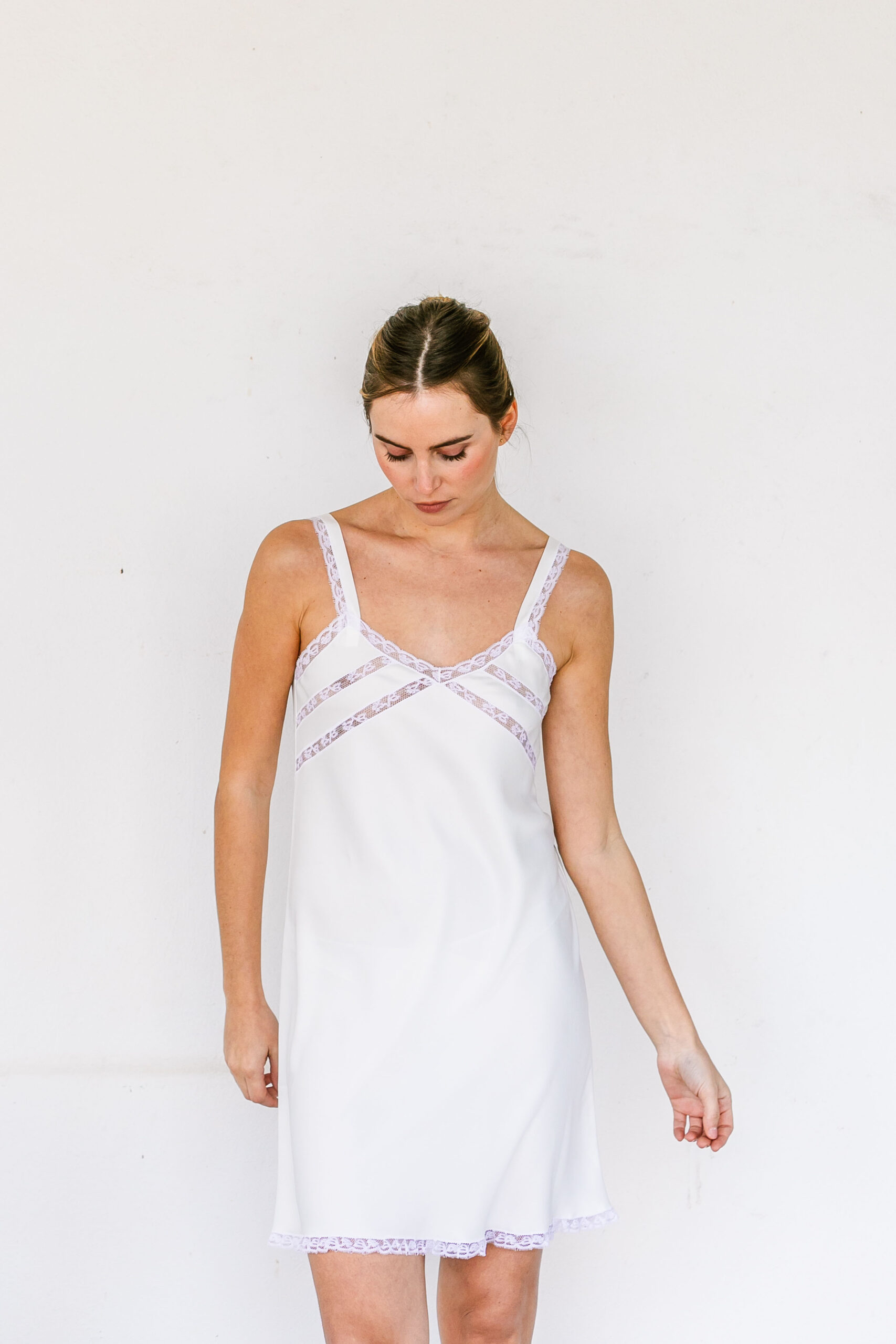 - Camisón de raso blanco corto con encajes en escote, tirantes y en diagonal.